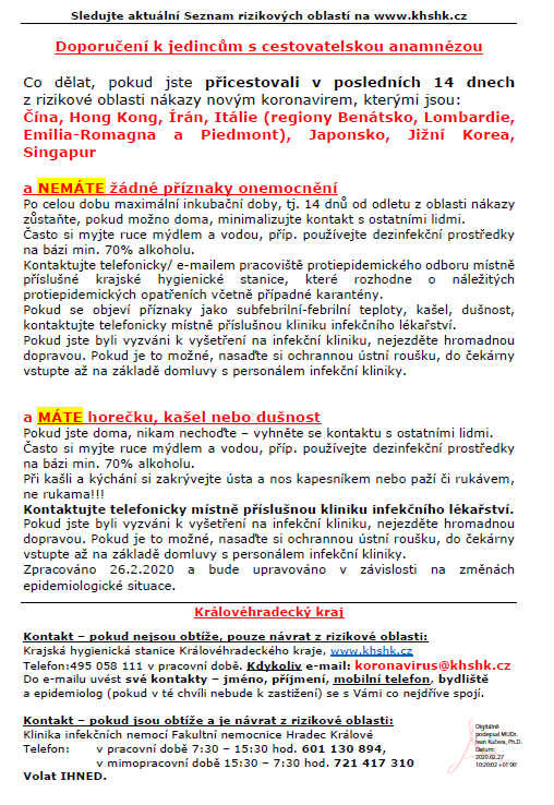 Krajská hygienická stanice Královéhradeckého kraje vydala Doporučení k jedincům s cestovatelskou anamnézou. Vzhledem k blížícím se jarním prázdninám, které jsou často spojeny se zájezdy do zahraničních lyžarských středisk, prosíme o přečtení a dodržení doporučení.