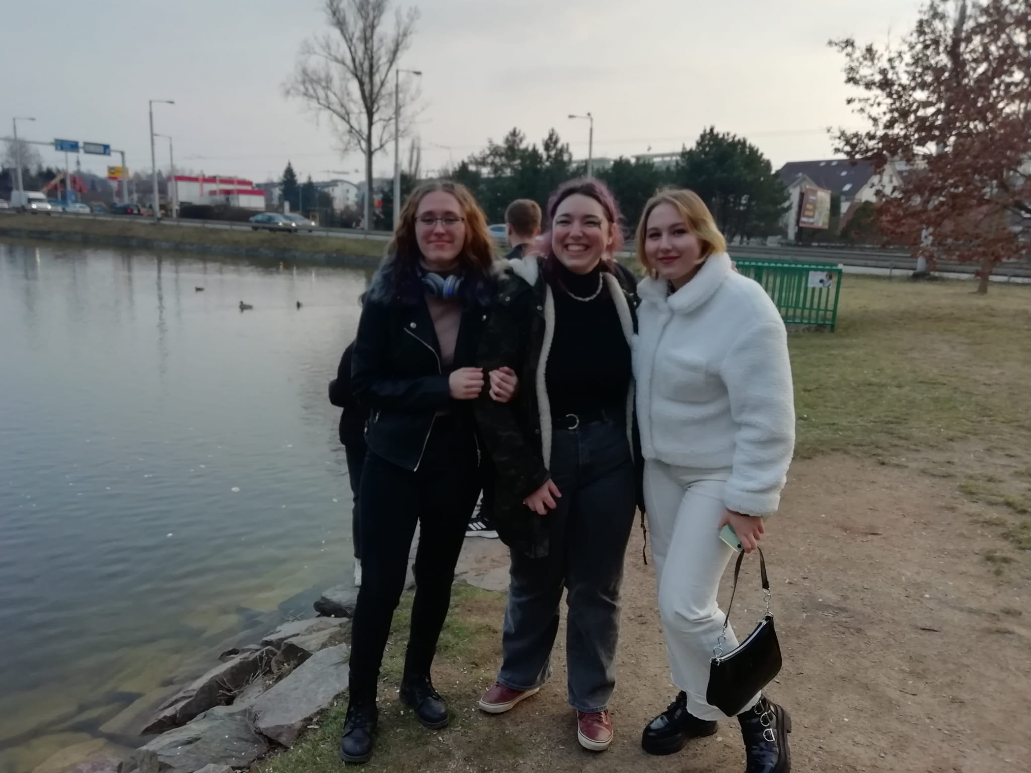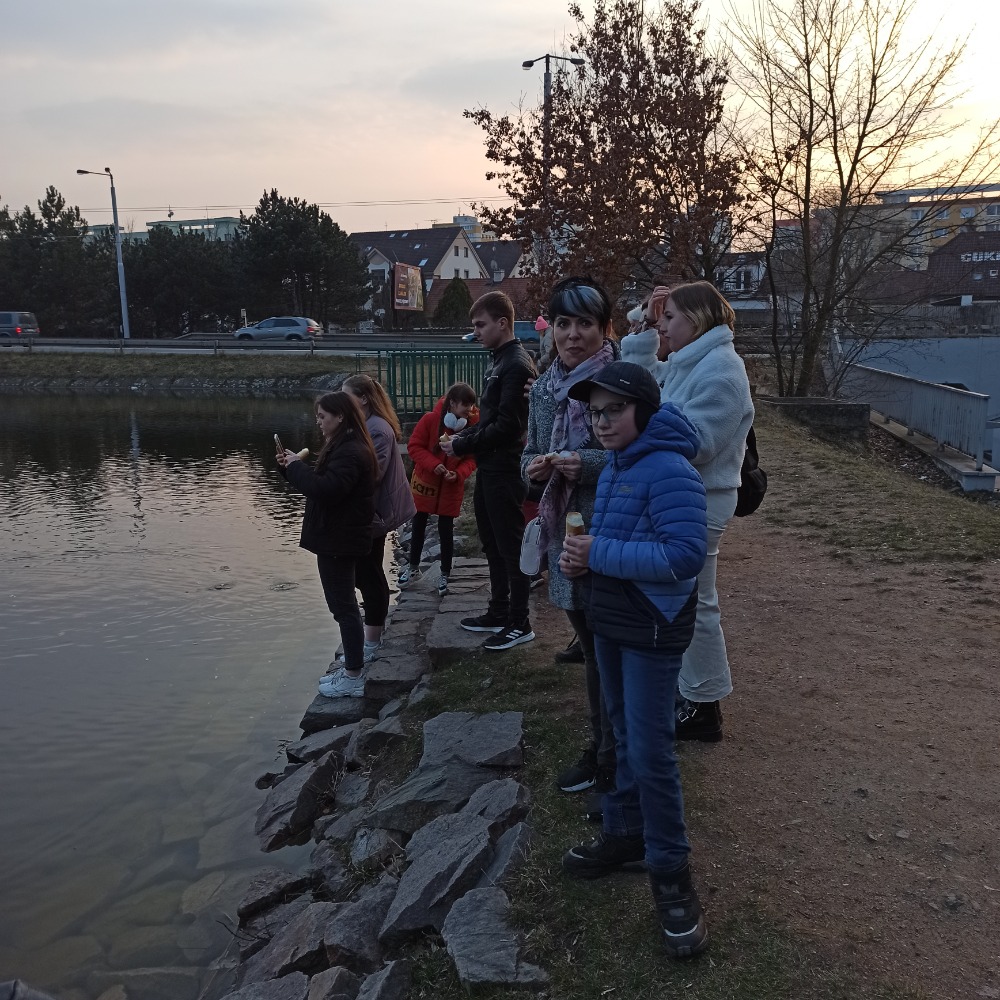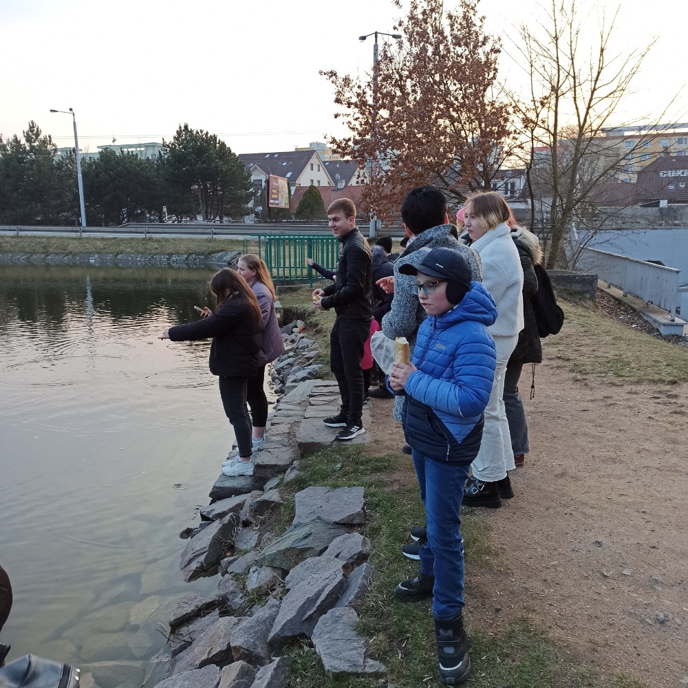 Ve čtvrtek 16.3.2022 v podvečerních hodinách jsme se vypravili pomoci ukrajinským dětem a jejich maminkám. Původně jsme si chtěli pohrát s dětmi v herně. Před ubytovnou nás ale čekalo překvapení – skupinka asi dvaceti pěti Ukrajinců s velkým zájmem o procházku. Rozhodli jsme se proto ukázat jim část hradeckých lesů. Cestou jsme nakrmili kachny a ryby na rybníku Plachta, pozorovali divoké koně v ohradě u rybníku Jáma. Nakonec jsme dorazili k rybníku Češík, kde se milým hostům moc líbilo, a tak nás společně napadlo, že bychom se sem mohli vrátit s cílem opéci si buřty. Celou cestu jsme si povídali v ukrajinsko-rusko-česko-anglickém jazyce, nepohrdli jsme ani rukama a překladačem v mobilu. Ani bystrý pozorovatel by nerozlišil Čecha od Ukrajince. Příjemný podvečer skončil velice vřelým rozloučením. Díky patří především Aničce a Julii z 2.B za organizaci, jejich volný čas, ale především za vytvoření nenucené přátelské atmosféry.