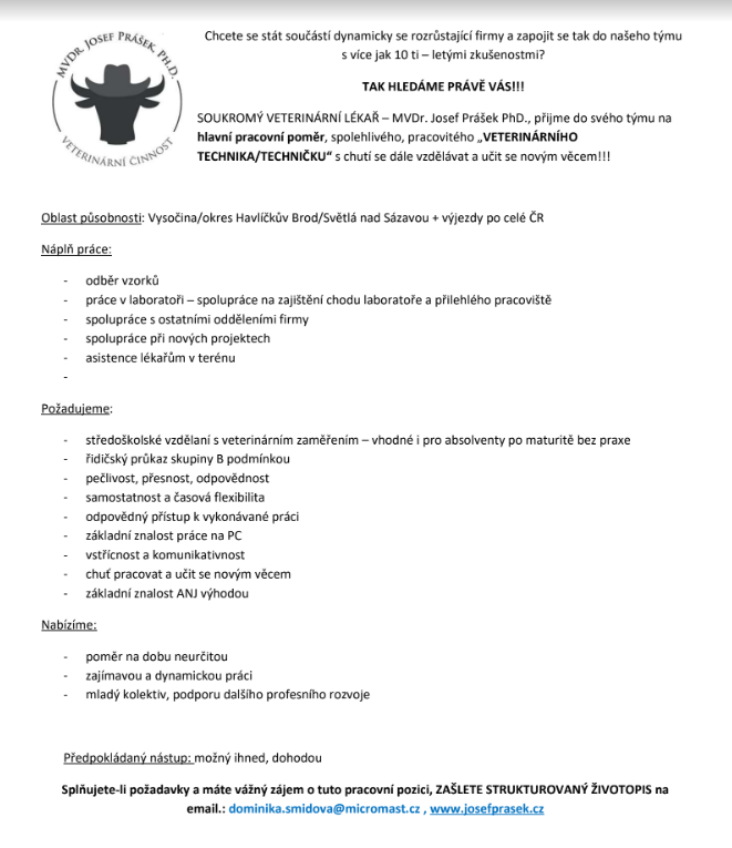 Firma MVDr. Josef Prášek Ph.D., se sídlem Dolní Březinka u Světlé nad Sázavou shání na pracovní pozici veterinární technik/technička nového uchazeče. Rádi dáme možnost uchazečům, kteří ukončují vzdělaní a mají zájem se v oboru dále pohybovat.