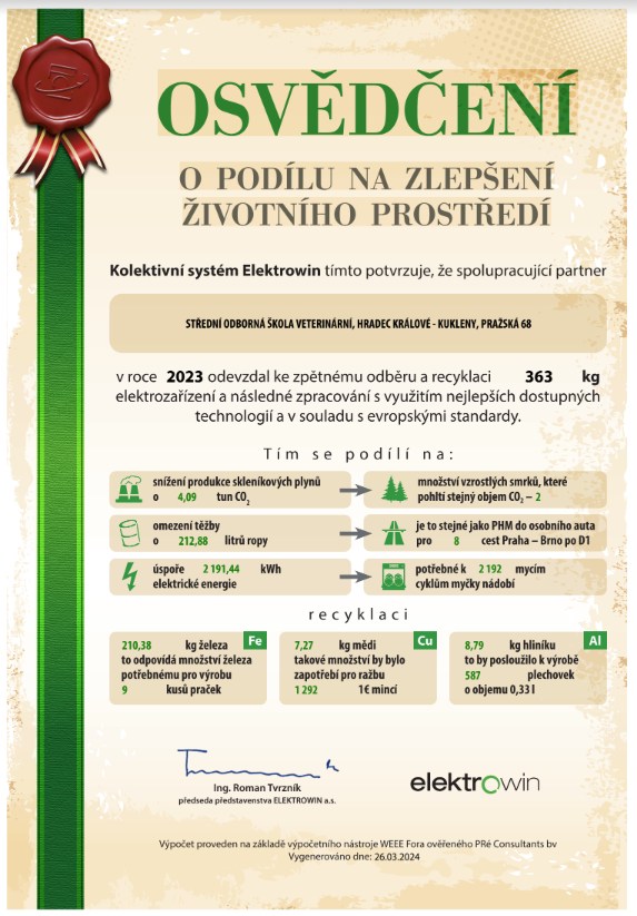 Konkrétní přínos obyvatel vyčísluje Osvědčení o podílu na zlepšení životního prostředí, které na základě dosažených výsledků vystavil kolektivní systém pro sběr a recyklaci vysloužilých spotřebičů